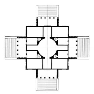 Die vier gleichgestalteten Portiken (Tempelvorbauten) wiederholen sich in alle Himmelsrichtungen, und bilden die Form eines Griechischen Kreuzes. Darüber liegt als Mittelpunkt eine Kuppel, die dem Gebäude eine nahezu „perfekte“ Ausgewogenheit gibt.