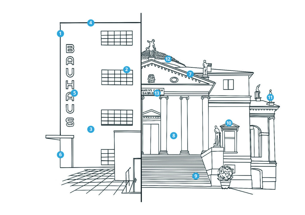 Das geteilte Vergleichsbild unterstützt diesen Ansatz. Durch die mittige Trennung und das unmittelbare Aneinanderfügen der beiden Gebäude werden Unterschiede in Form, Symmetrie, Material und Wirkung auf einen Blick erkennbar. So wird der architektonische Wandel zwischen Renaissance und Moderne visuell erfahrbar und nicht nur theoretisch beschrieben.